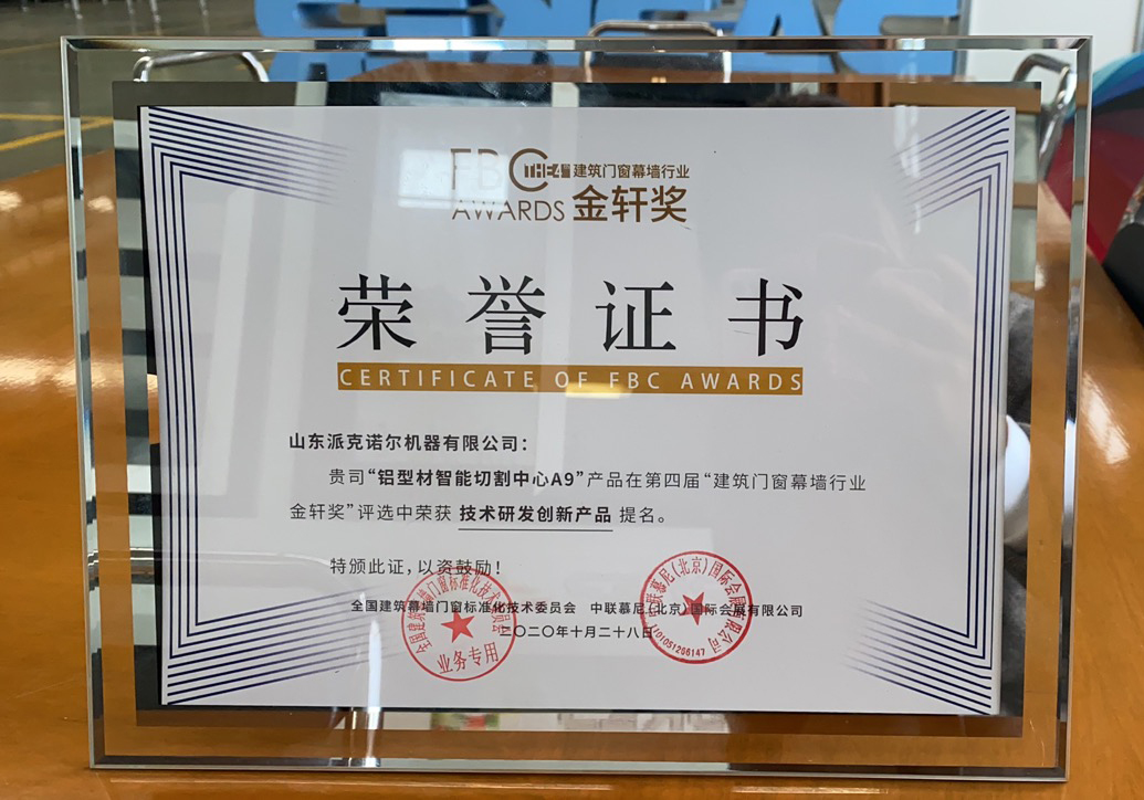 山東派克諾爾機器有限公司,技術中心自主研發的鋁型材智能切割中心A9在北京第四屆“建筑門窗幕墻行業金軒獎”評選中,經過層層考核評審,榮獲技術研發創新產品提名獎。
