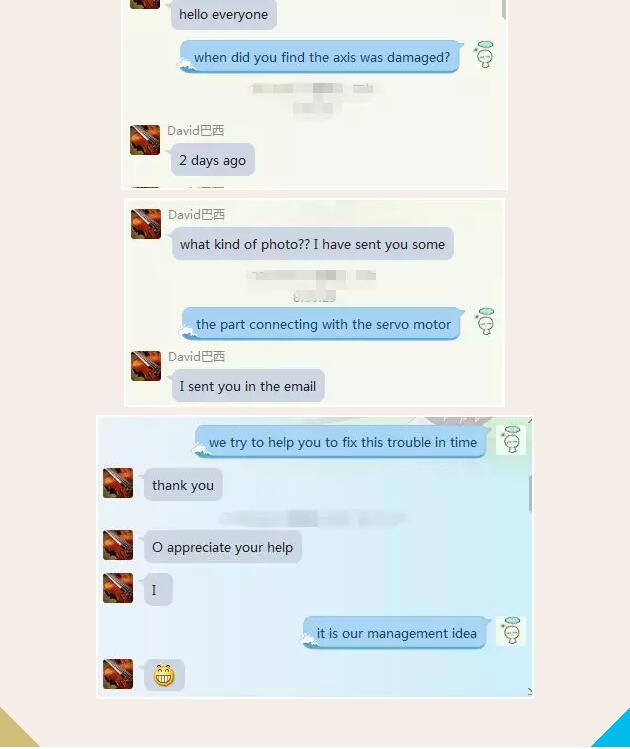 印度客戶,于2013年從派克購買數控清角機。近日,由于新員工誤操作,導致設備運行出現問題??蛻魪挠《饶沁叞l過來求助信息,海外事業部的業務員通過Skype與該客戶取得聯系,進一步了解設備故障出現的原因,故障出現時呈現的狀態等,再與技術工程師溝通交流,了解可能導致的原因以及用對措施,通過圖片、視頻,在線視頻等途徑進行跨國通話,最終發現問題出現在數控系統之中。于是,技術部和售后服務部齊心協力將解決方案以圖片以及視頻的方式多元素,多途徑展示給客戶,指導客戶如何編程,并編寫一套代碼數據發送過去,最終該清角機一切數據恢復正常,六把刀又重新正常流利工作(客戶與海外事業部業務員部分聊天記錄)